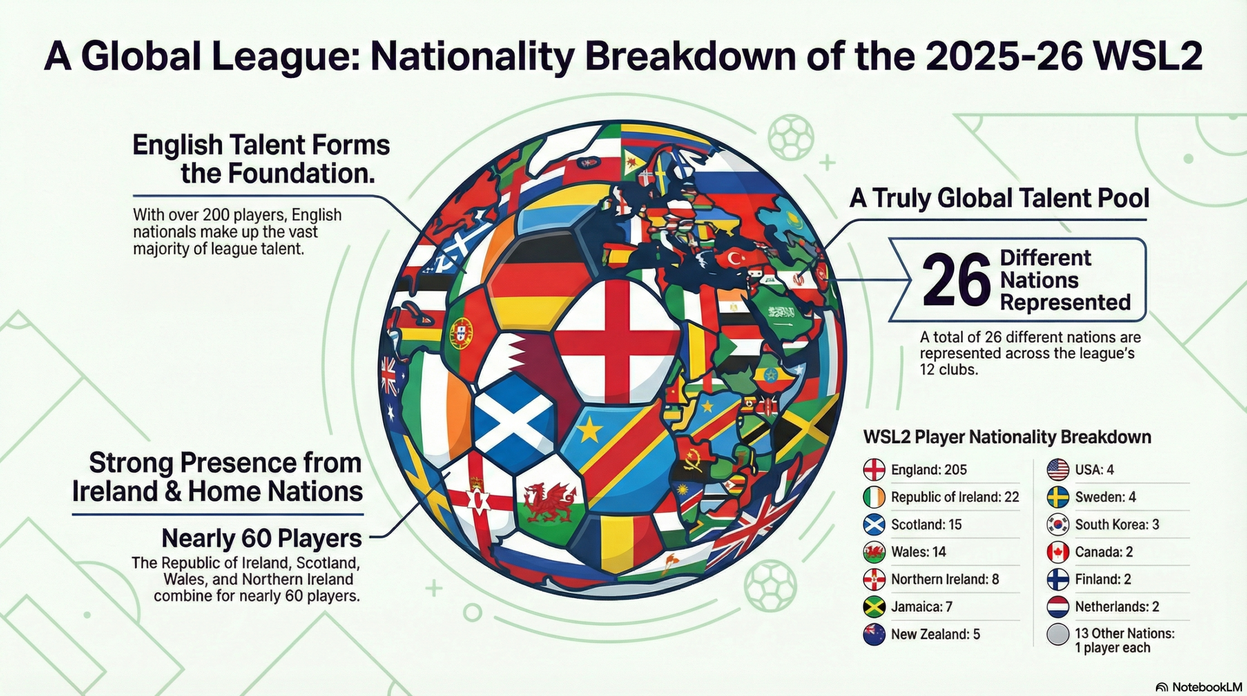 Based on the comprehensive roster data for the twelve clubs in the 2025–26 Women’s Super League 2 (WSL 2), a breakdown of player nationalities reveals a strong dominance of players from the Home Nations (England, Scotland, Wales, Northern Ireland, and Ireland), supplemented by a diverse group of international players.